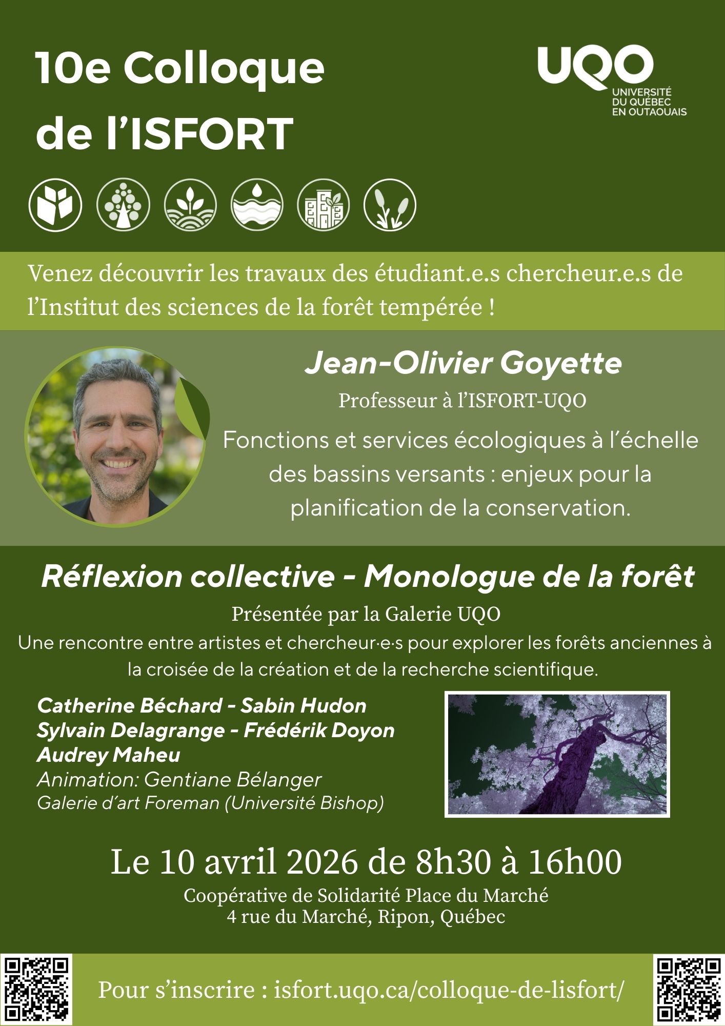 L’Institut des Sciences de la Forêt Tempérée (ISFORT) et le département des sciences naturelles de l’UQO ont le plaisir de vous inviter au 10e colloque de l’ISFORT qui aura lieu le 10 avril 2026 à la Coopérative de la place du marché à Ripon de 8h30 à 16h00.